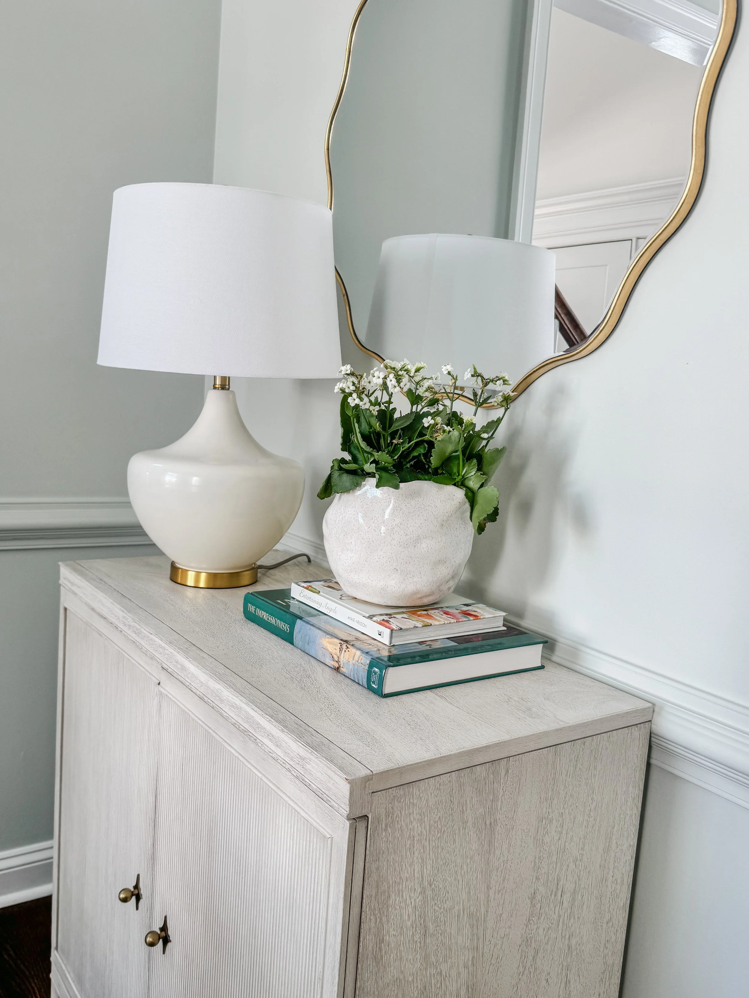 In the entryway, which is right off of this dining room, we updated the light fixture and stair runner, both turned out lovely! They are both simple and timeless in the perfect way.